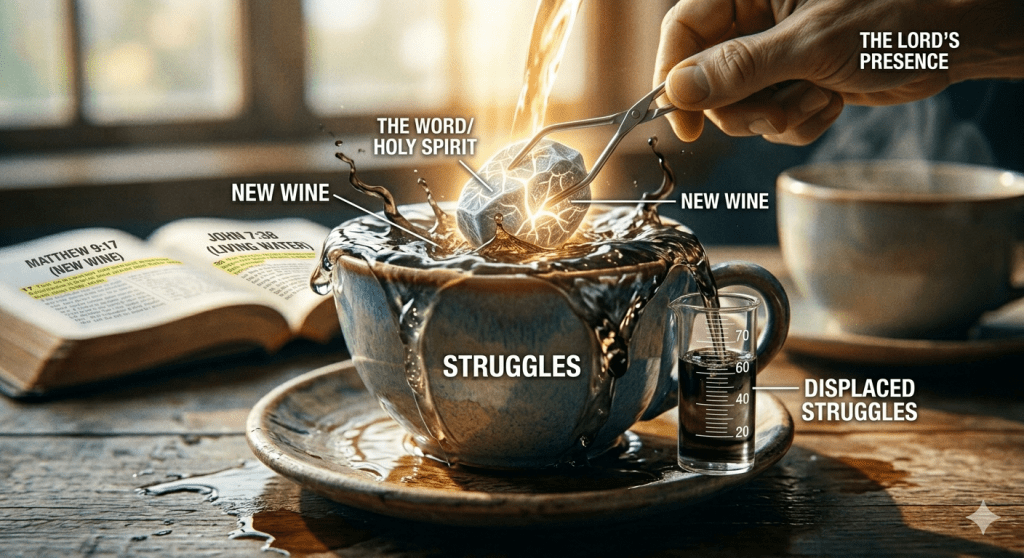 Theologically, we cannot be filled with the New while clinging to the Old. When you pour fresh, living water into a cup that is already full, something has to give. The original contents must spill over the sides to make room for the new.